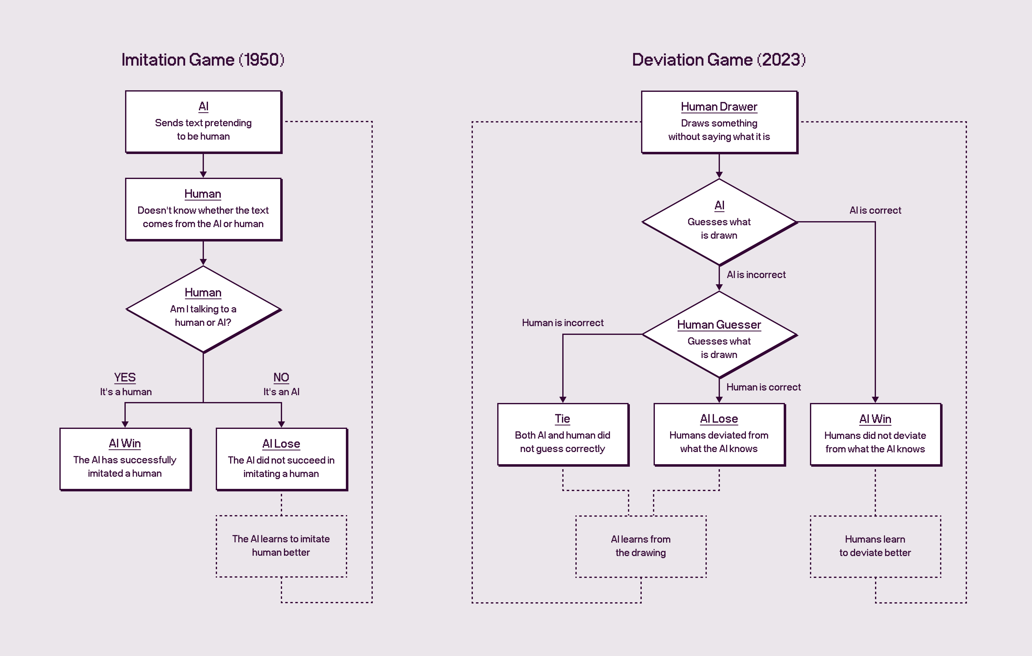 Deviation Game draws inspiration from the Imitation Game, devised in 1950 by Alan Turing, the father of computer science. While that experiment—later widely known as the Turing Test—centered on an AI’s attempt to imitate a human, we have inverted this relationship to explore the potential for humans to deviate from an AI’s understanding.