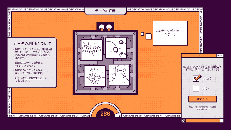 本作は2022年にシビック・クリエイティブ・ベース東京[CCBT]でのアートインキュベーションプロジェクトの一環として、『デヴィエーションゲーム ver 1.0』という名前でスタートしました。これまでにアルス・エレクトロニカ(リンツ)、Now Play This(ロンドン)、Taipei Digital Art Festival(台北)など、世界的な展示やイベントで公開され、あらゆる年齢層の観客を魅了し、AIと創造性についての重要な議論を喚起してきました。