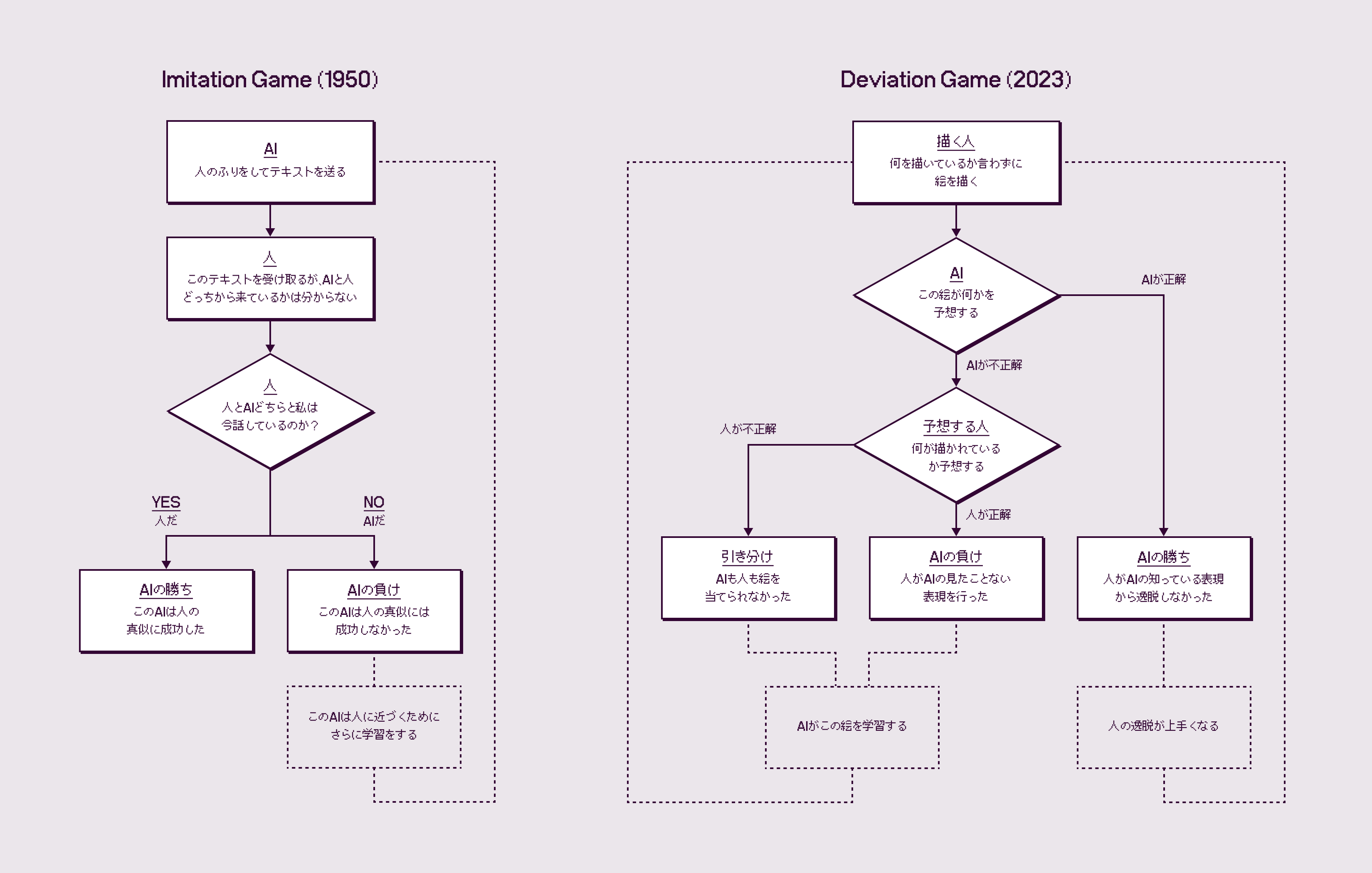 「デヴィエーション・ゲーム」は、コンピューターサイエンスの父、アラン・チューリングが1950年に考案した「イミテーション・ゲーム」から着想を得ました。のちにチューリングテストとして広く知られるこの実験では、AIが人間を模倣しようとすることが焦点でしたが、私たちはこの関係を逆転させ、人間がAIの理解から逸脱する可能性を探求しています。